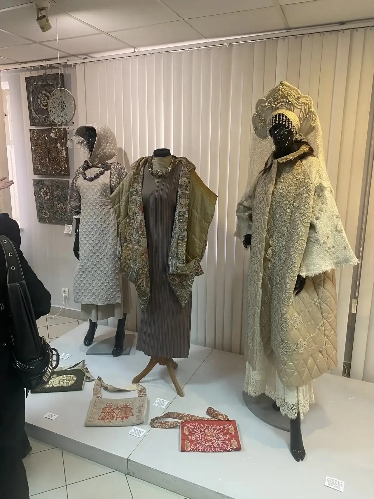 Преподаватели представили костюмы в русском стиле, броши, а студенты показали картины в технике батик-роспись по шелку.