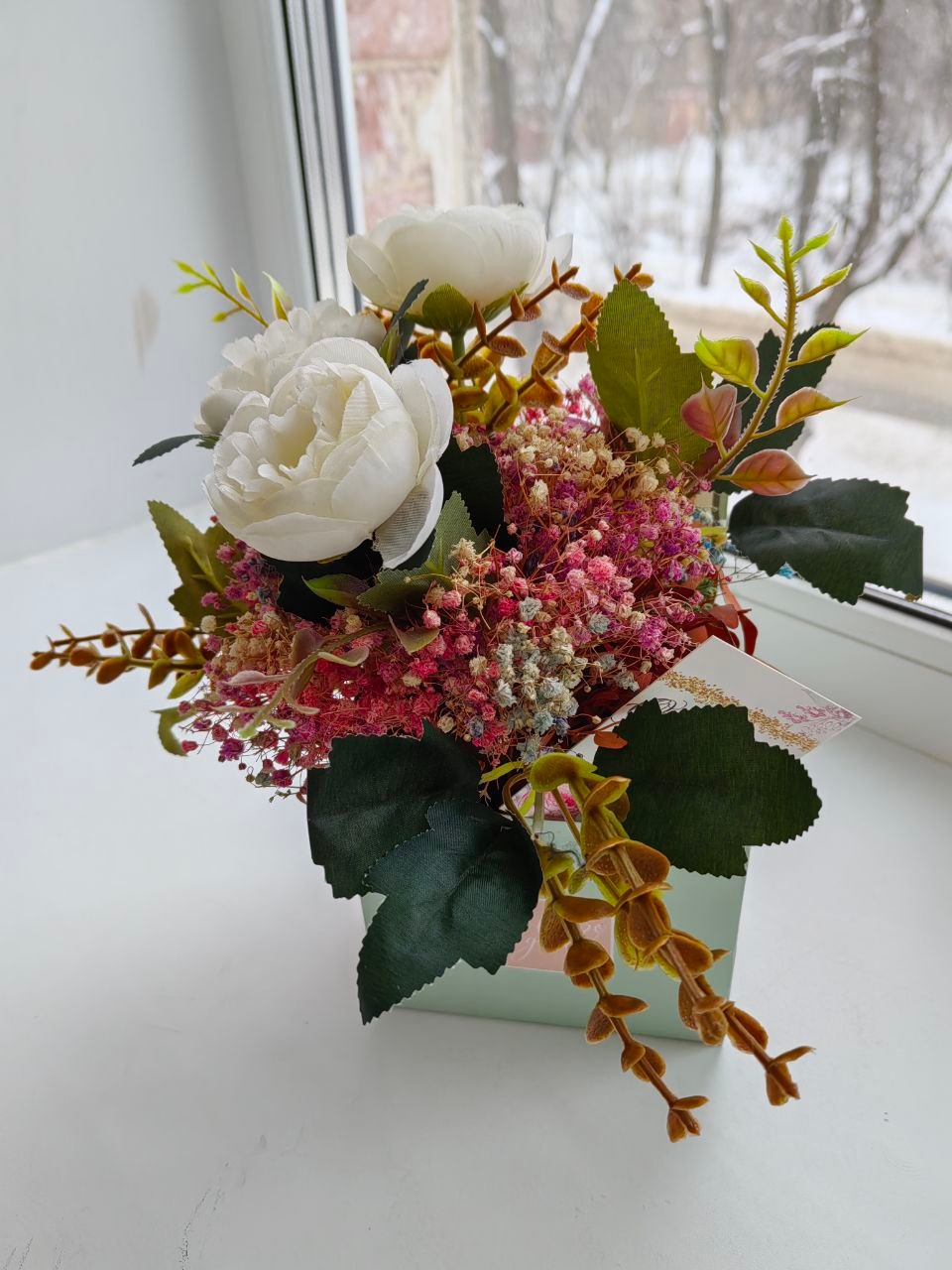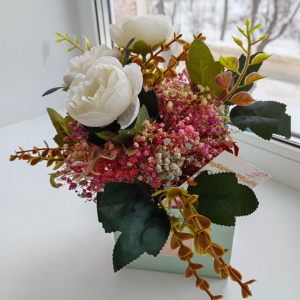 Во втором сделали букет с искусственными цветами и сухоцветами