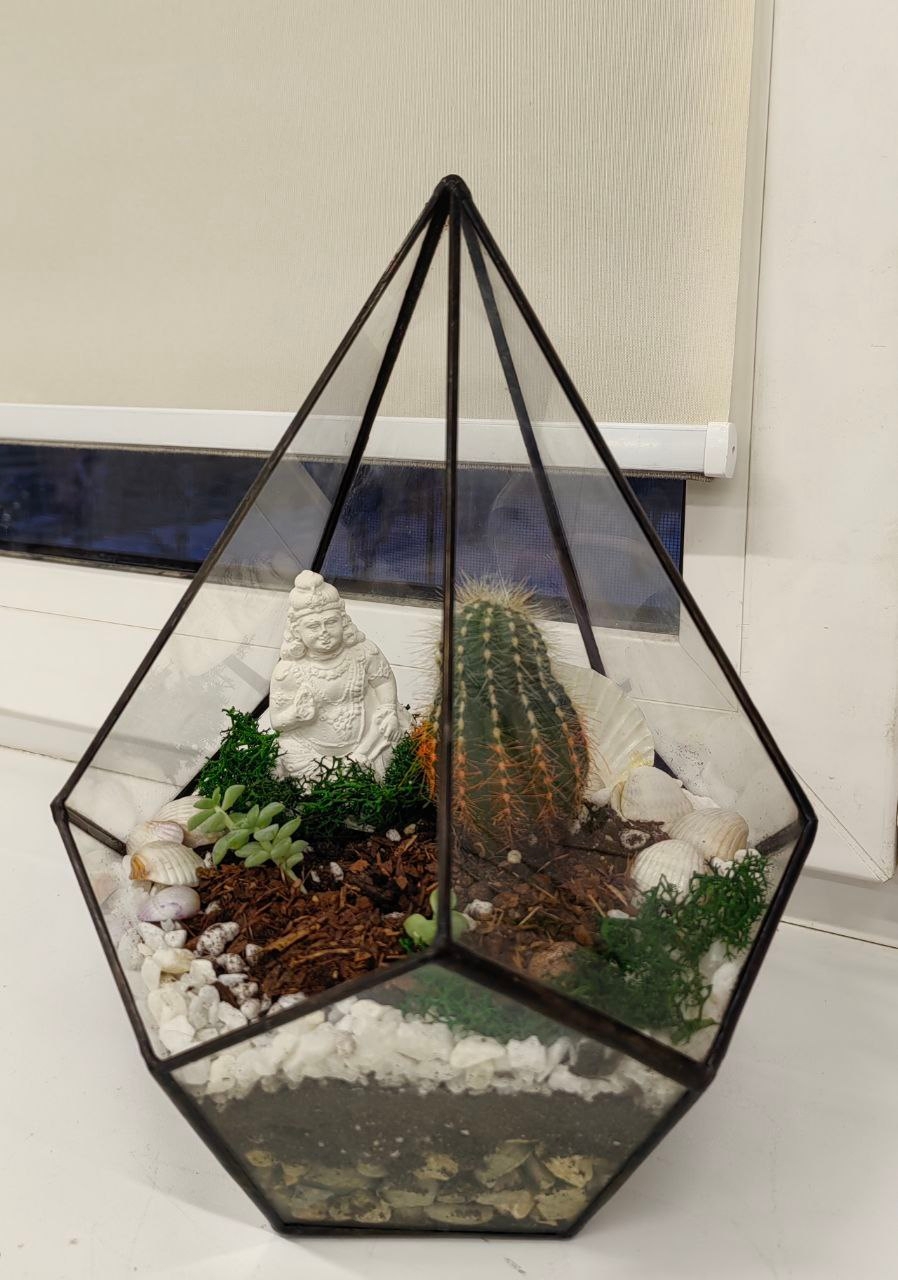 В первом корпусе занимались изготовление флорариум с кактусом и суккулентами, украшенные ракушками, мраморной крошкой и скульптурой