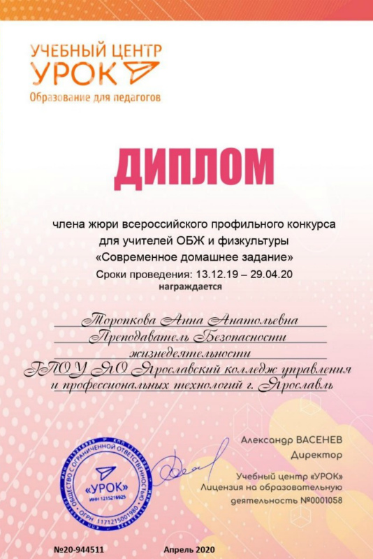 Торопкова Анна Анатольевна получила официальное право оценивать работу преподавателей и учителей России по конкурсам своего предмета "ОБЖ". На сегодняшний день это её пятый диплом члена жюри всероссийских конкурсов. Бесспорно, это профессиональный рост и повышение квалификации педагога.