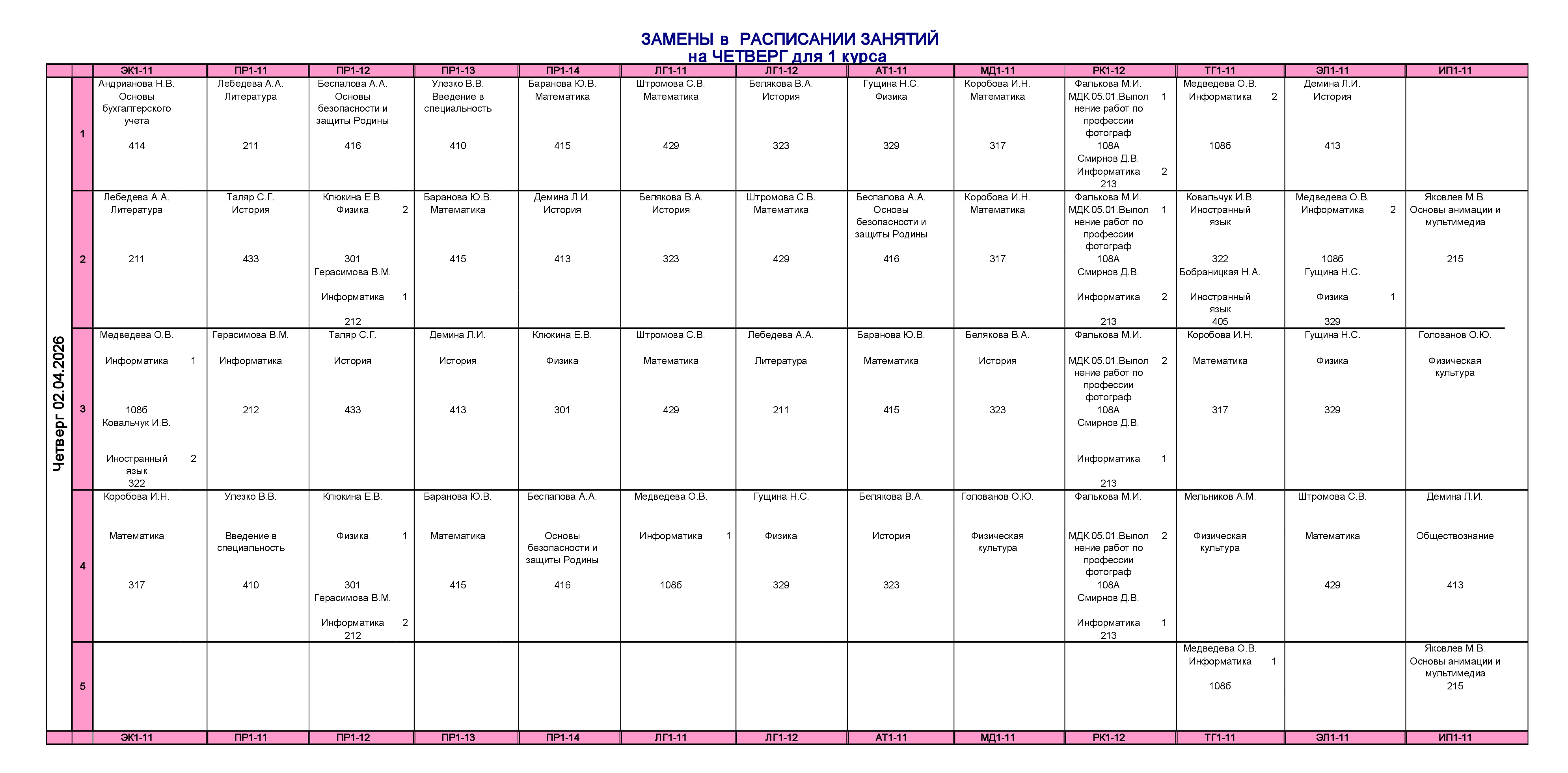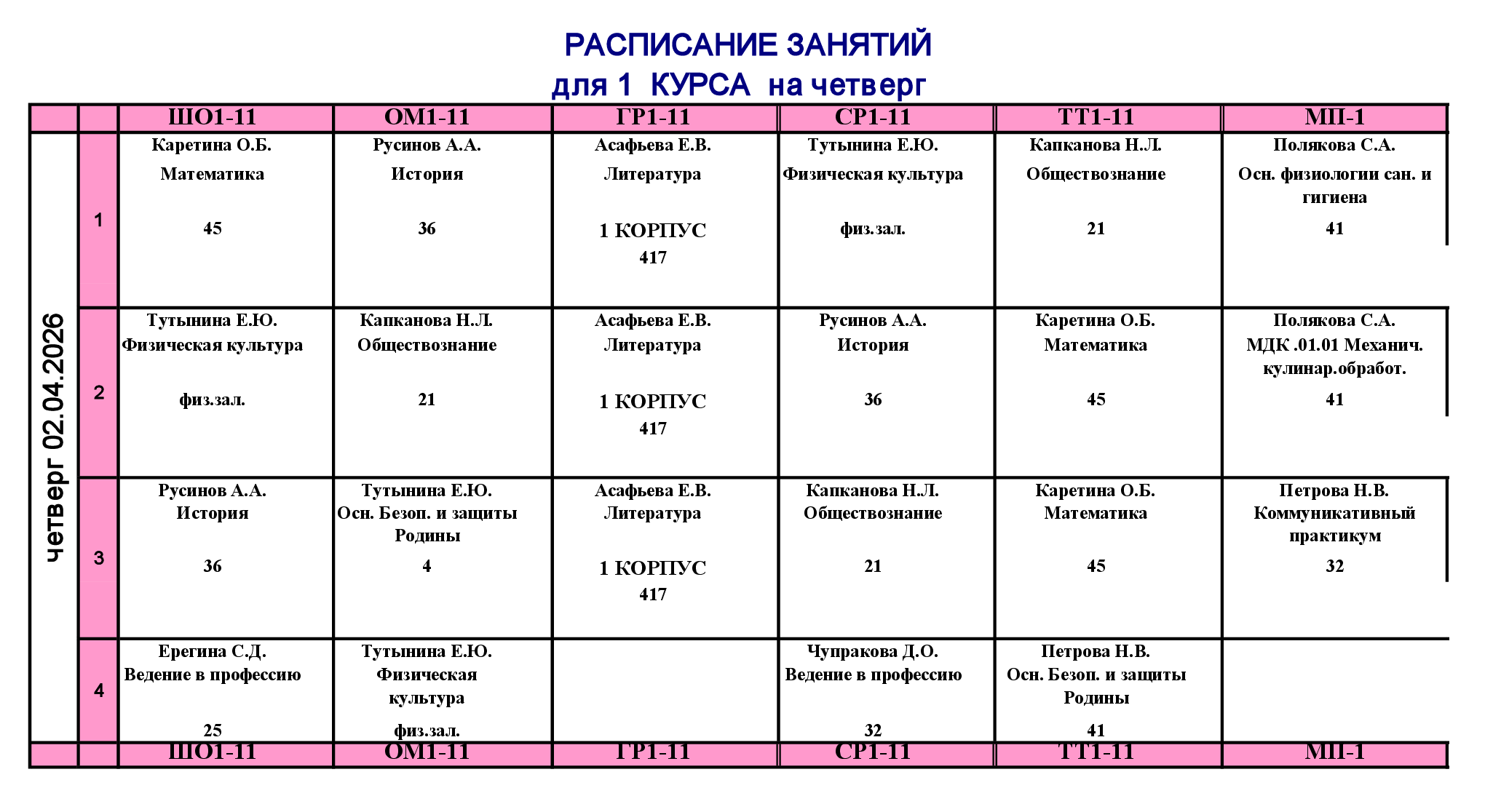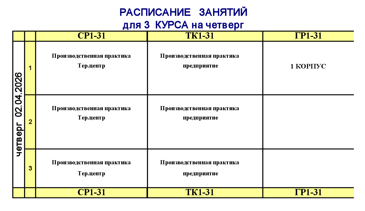 Расписание занятий для учебного корпуса №1
