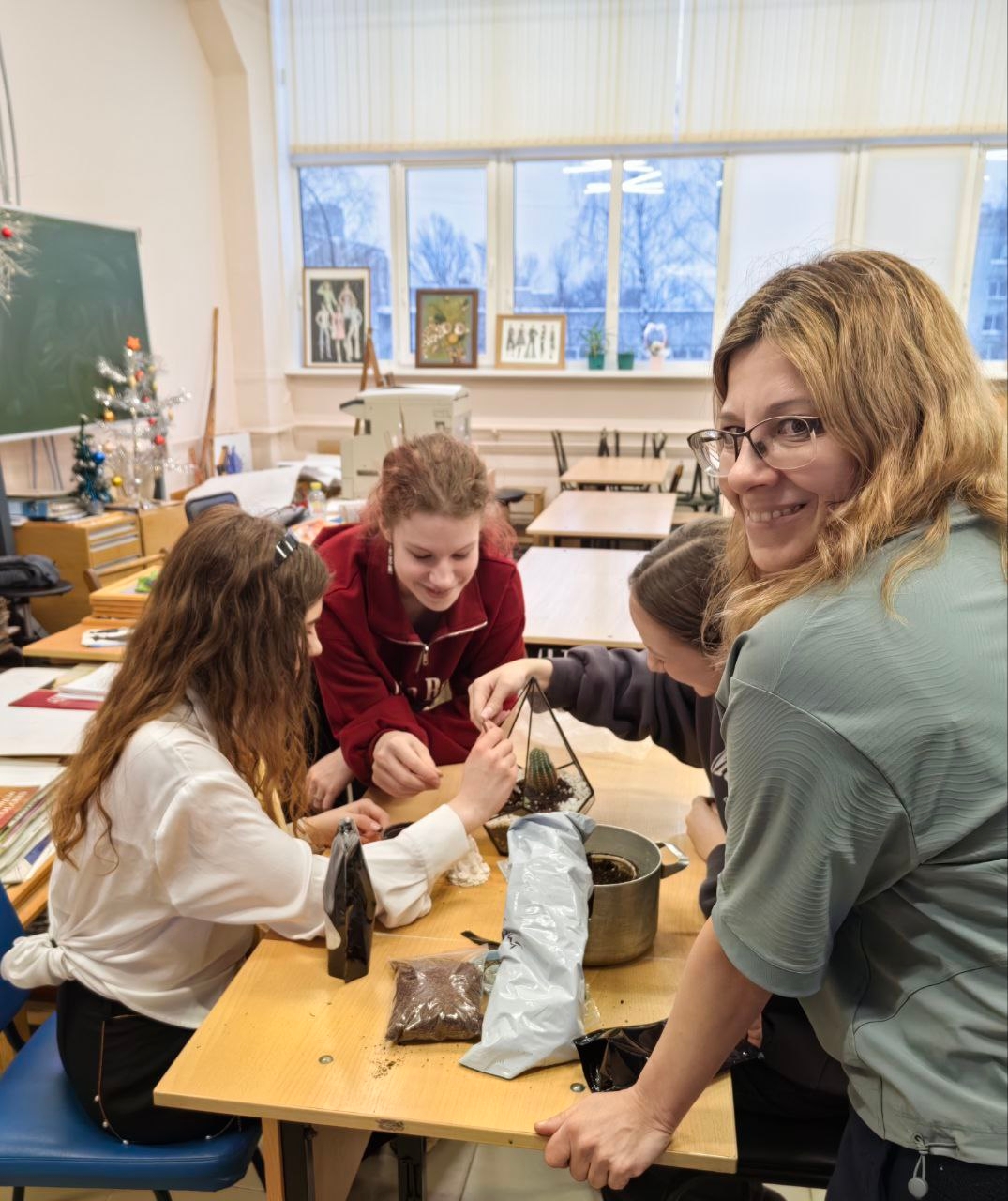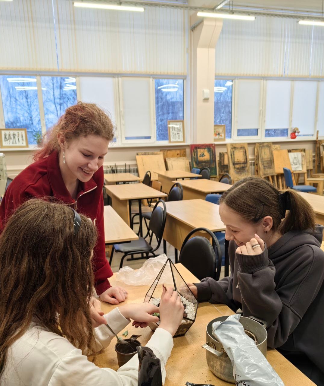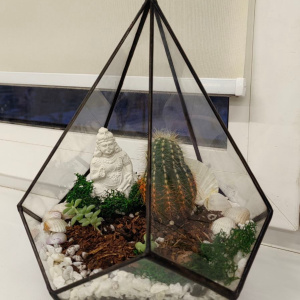 В первом корпусе занимались изготовление флорариум с кактусом и суккулентами, украшенные ракушками, мраморной крошкой и скульптурой