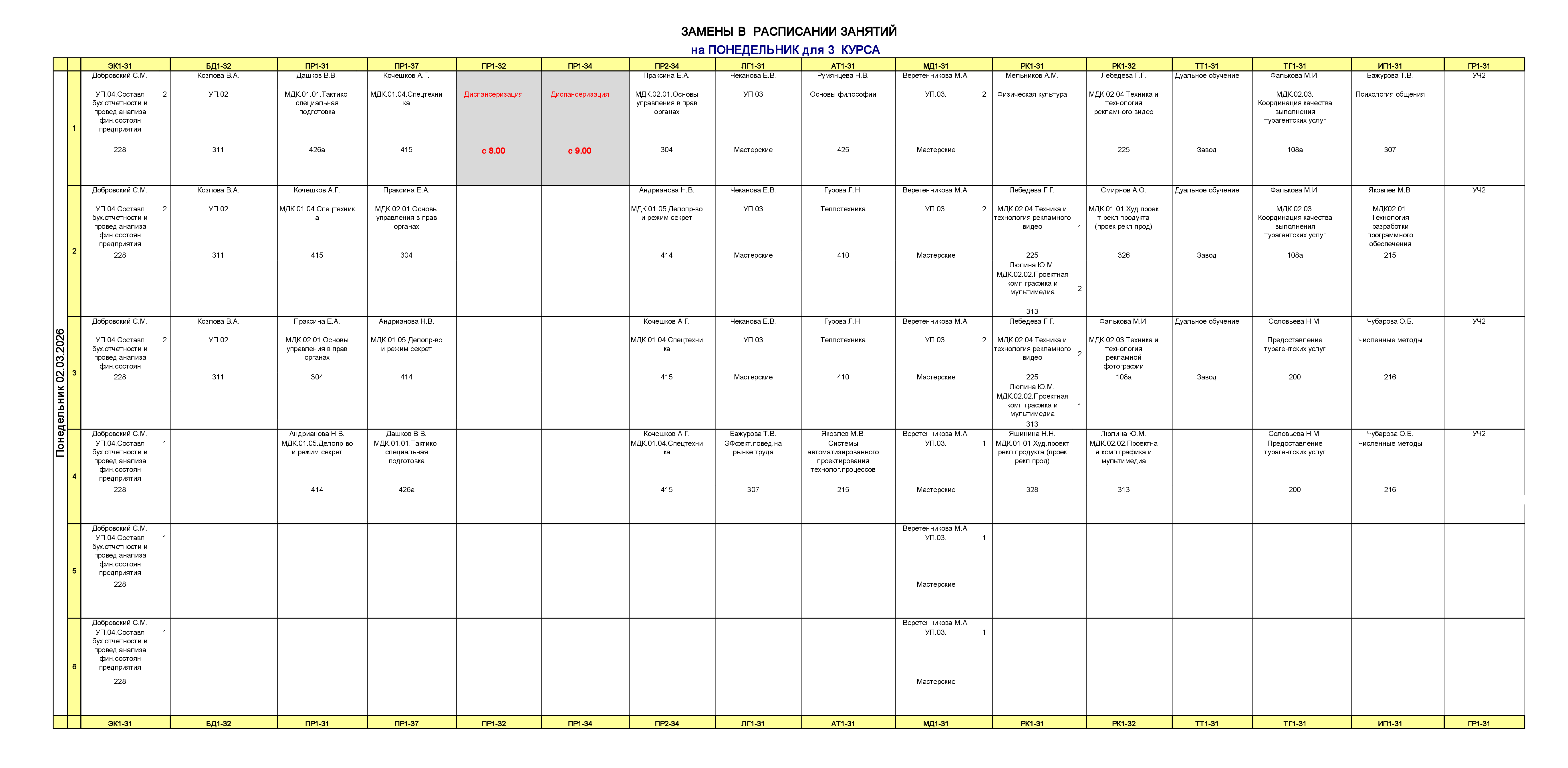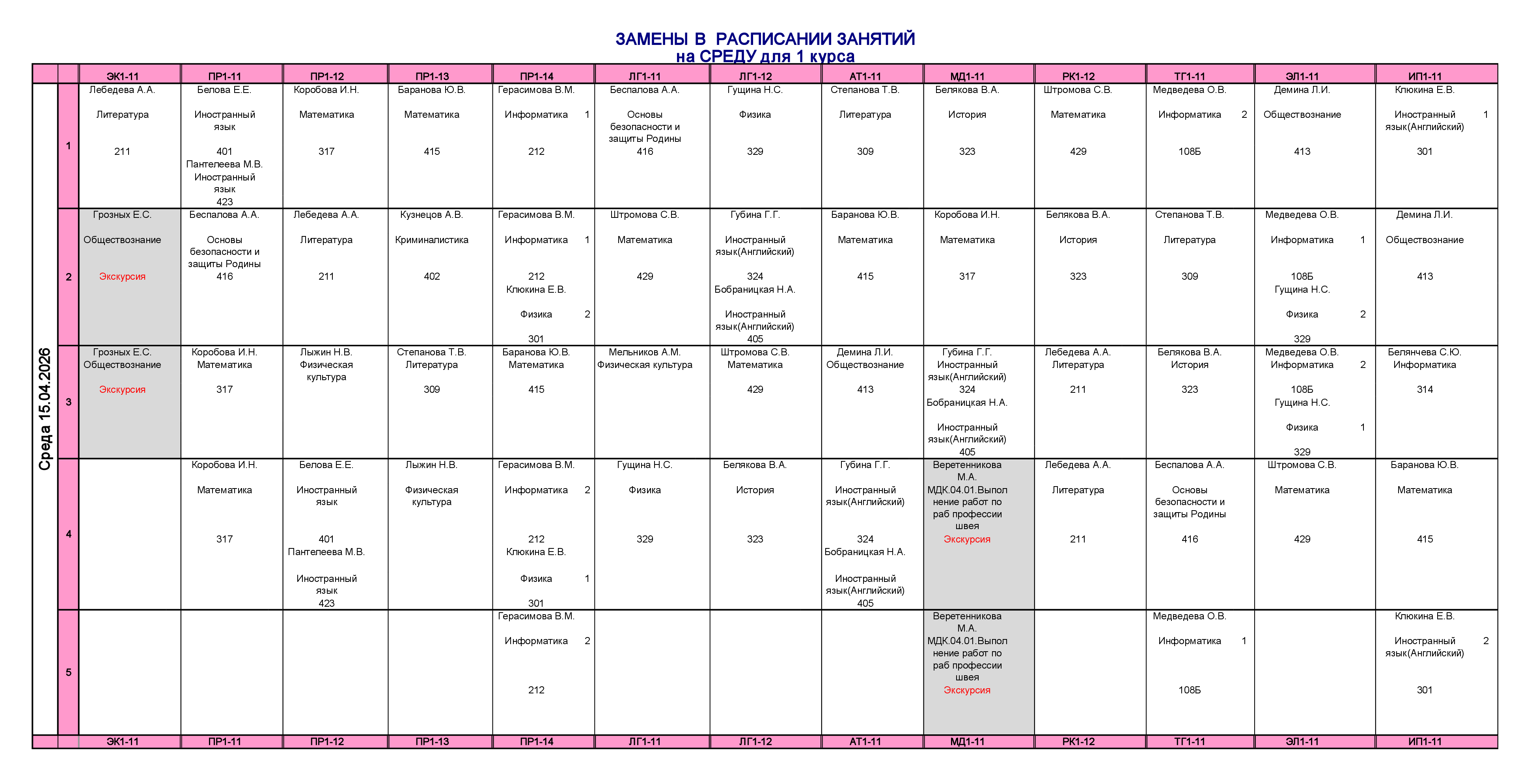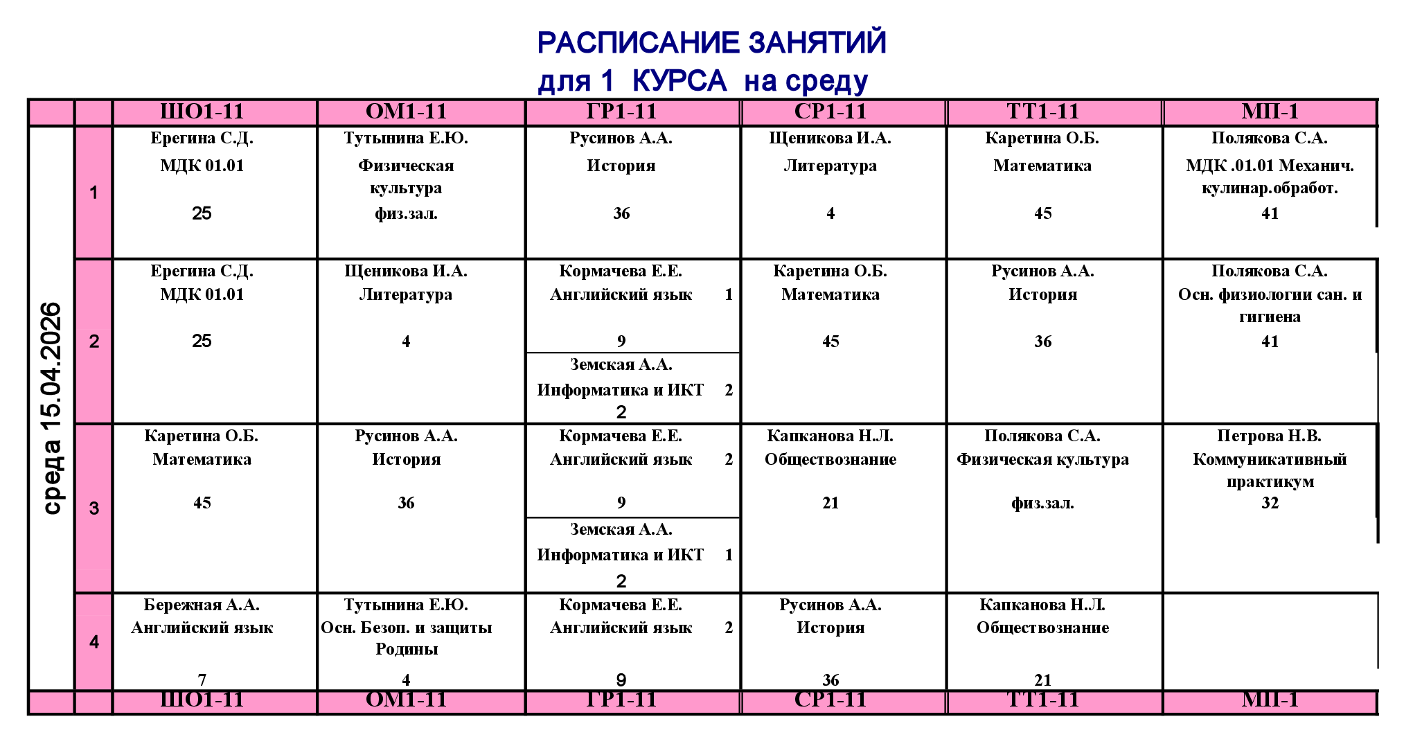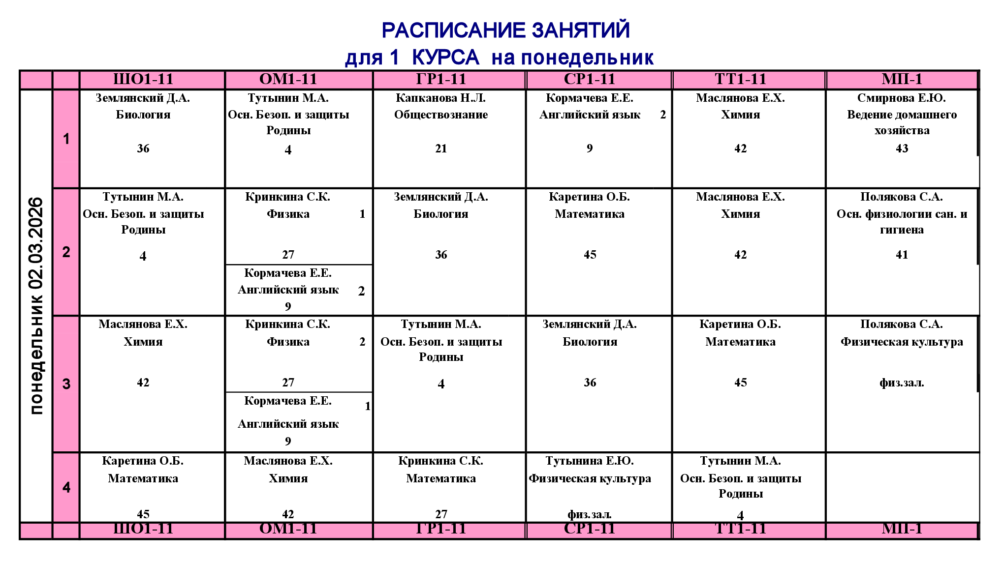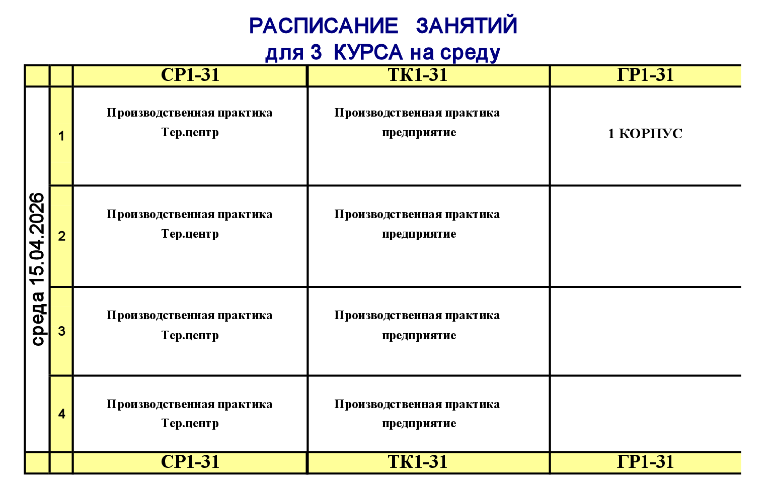 Расписание занятий для учебного корпуса №1